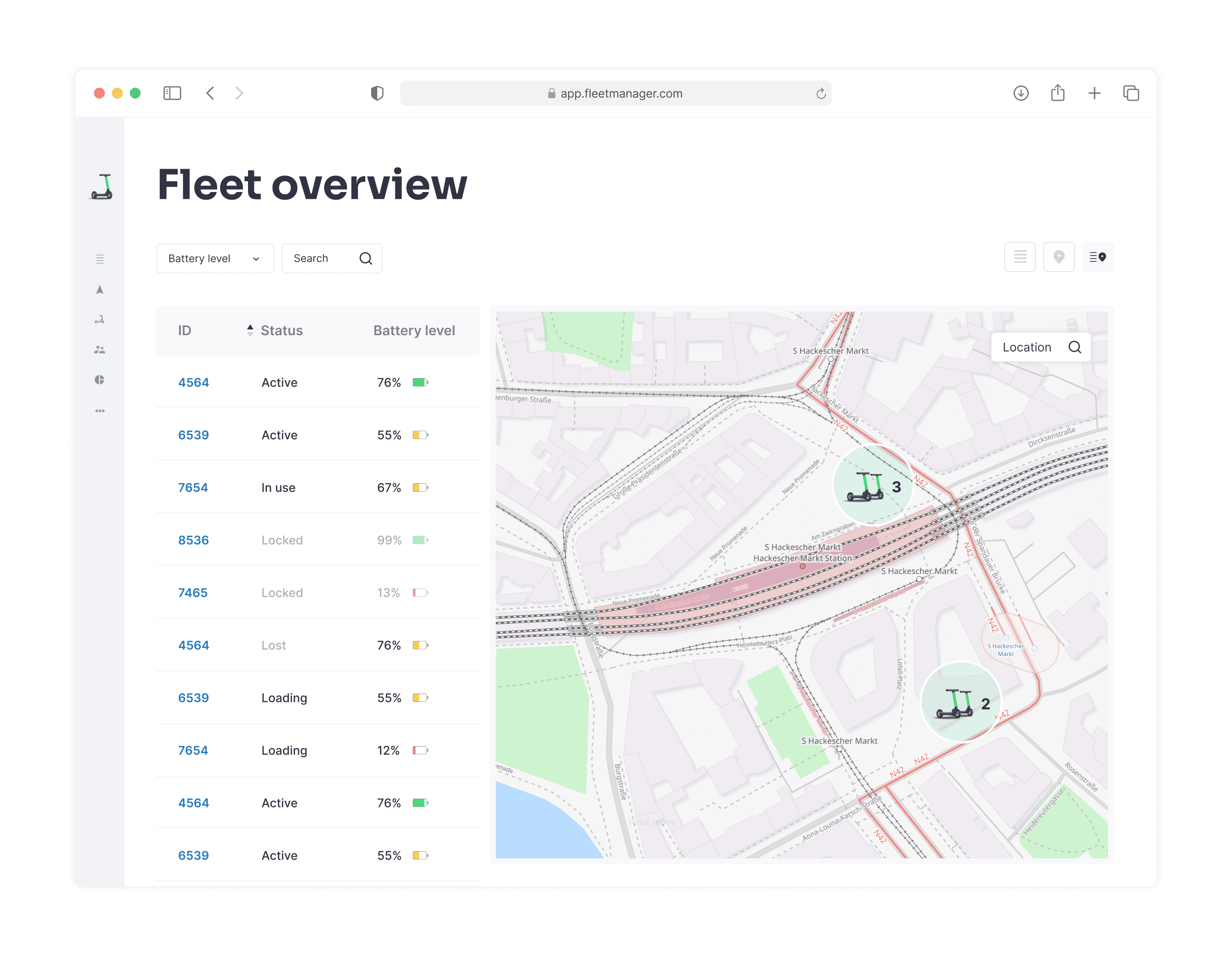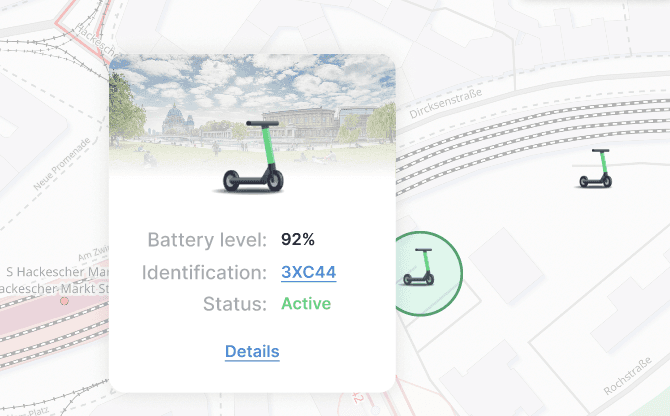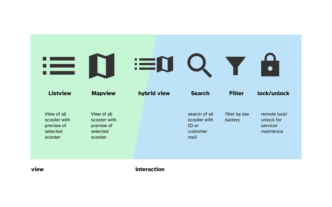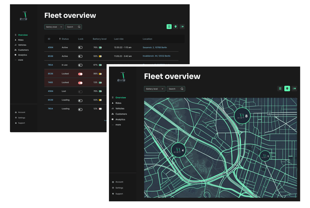As we were not certain about every use case we went with 3 views. Our assumption was that users change views based on use case, rather than the experience level of the user itself. The view depends highly on what a user tries to archive: either managing a bunch of scooters or determine single ones. Location – for example – only is important to display on a map, when a relationship to specific buildings/streets needs to be determined.