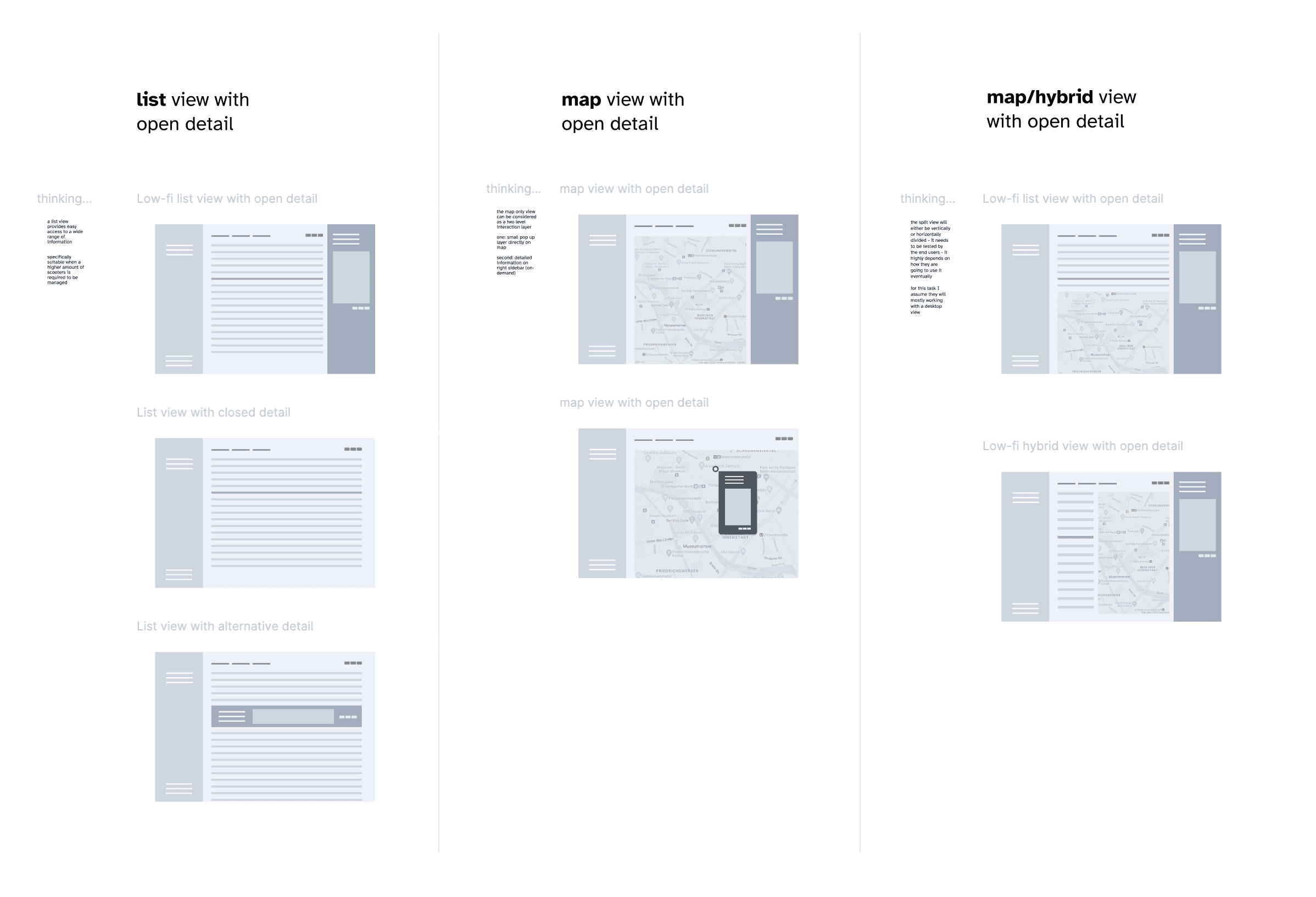 Dealing with only some vague requirements and hypothesis and the fact, that there are already quite similar interfaces out in the wild I went with a fast and very pragmatic approach. Desk research, simple design exploration, with a segmentation of view and interaction layers to determine where the blind spots are.